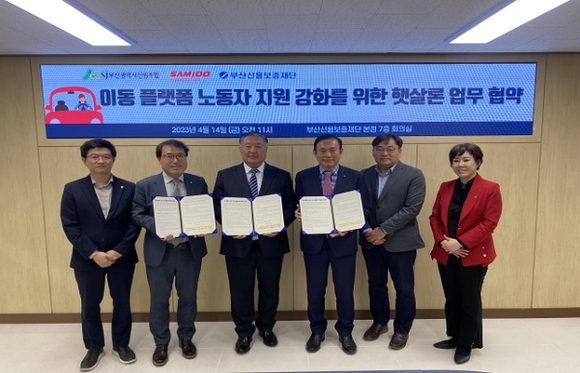 부산신용보증재단이 14일 오전 재단 본점에서 삼주, 부산시 산림조합과 함께 이동 플랫폼 노동자 지원 강화를 위한 업무협약을 체결했다.
