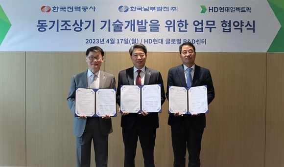 이날 협약식에는 남부발전 박영철 발전처장, 전력연구원 이중호 원장, HD현대일렉트릭 김영기 부사장 등이 참석했다. 이번 협약에 참여한 3개 기관은 동기조상기를 포함, 발전소에서 운영하는 회전기기 분야에 대해 포괄적인 기술개발 및 상호협력을 강화하는데 뜻을 같이했다.