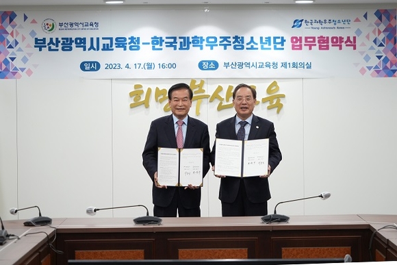 하윤수 부산시교육감이 17일 오후 4시 부산시교육청 본관 2층 제1회의실에서 한국과학우주청소년단과 업무협약식을 가졌다.