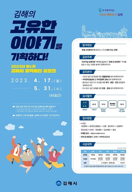 경남 김해시는 시민의 꿈과 개성이 담긴 정책아이디어를 귀담아 듣고 시정에 반영하고자 올해 1회 김해시 정책제안 공모전을 실시한다고 17일 밝혔다.