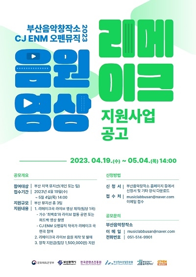 부산시와 부산정보산업진흥원이 부산음악창작소를 통해 다음달 4일까지 ‘2023 리메이크 음원·영상 지원사업’에 참여할 부산 지역 뮤지션을 모집한다고 밝혔다.