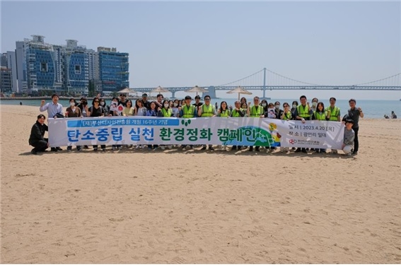 부산디자인진흥원이 지난 20일 기관 설립 16주년을 기념해 광안리 인근을 걸으며 주변에 버려진 쓰레기를 줍는 등 환경정화 활동을 전개했다.
