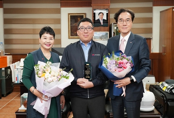 예경탁 은행장은 창원시 마산회원구 내서읍에 소재한 ㈜에스엘전자를 방문해 기업체 우수 사원 김민기 차장에게 표창패와 꽃다발을 수여했다.