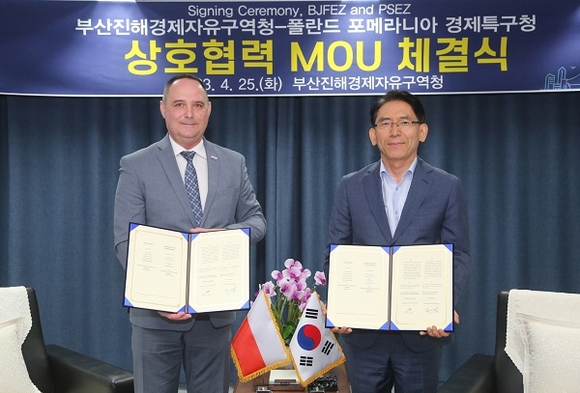 부산진해경제자유구역청이 지난 25일 폴란드 포메라니아 경제자유구역과의 협력관계를 강화하기 위한 MOU를 체결했다고 밝혔다.