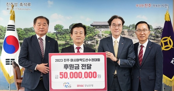 BNK경남은행은 '2023 진주 아시아역도선수권대회' 성공개최를 기원하기 위해 후원금 5천만원을 기탁했다고 26일 밝혔다.