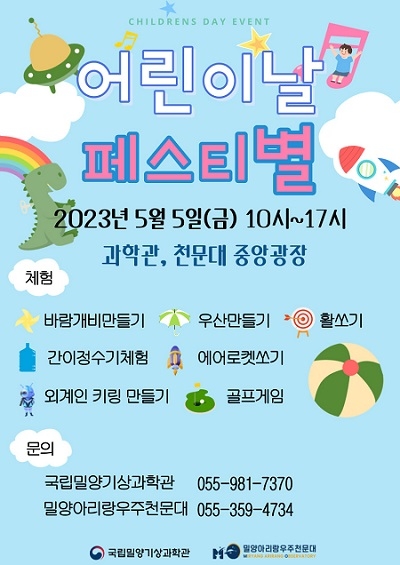 부산지방기상청과 밀양시시설관리공단은 어린이날(5/5)을 맞아 적극행정의 일환으로 국립밀양기상과학관·밀양아리랑우주천문대를 무료로 관람할 수 있도록 개방해 야외광장에서 다양한 볼거리를 제공하고 체험 프로그램 '어린이날 페스티별' 행사를 연다.