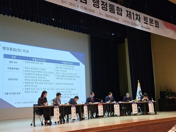 경남도와 부산시는 27일 오후 2시 도청 신관 대강당에서 부산-경남 행정통합 추진 제1차 토론회를 가졌다.