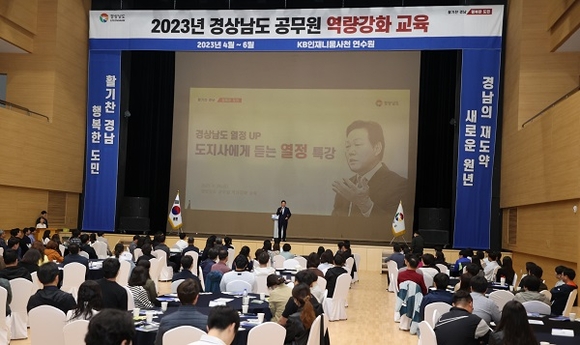 박완수 경남도지사는 28일 KB인재니움 사천연수원에서 도청 공무원 200여 명이 참석한 '제2기 2023년 경상남도 공무원 역량강화 교육'에서 ‘도지사에게 듣는 열정 특강’을 펼쳤다.