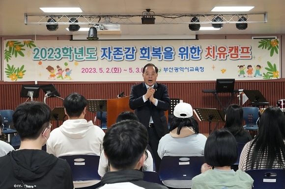 하윤수 부산시교육감이 2일과 3일 양일간 학생인성교육원과 화명수목원 등지에서 진행된 ‘2023학년도 학생 자존감 회복을 위한 치유캠프’에 방문해 학생들을 격려했다.