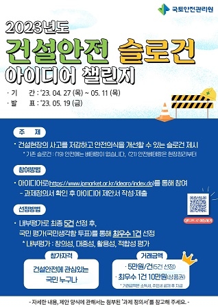 우수 및 최우수 슬로건에 대해서는 상품권 등 소정의 사례가 주어지며, 선정된 슬로건은 현수막과 포스터 등으로 제작돼 건설공사 현장점검 때 배포될 예정이다.