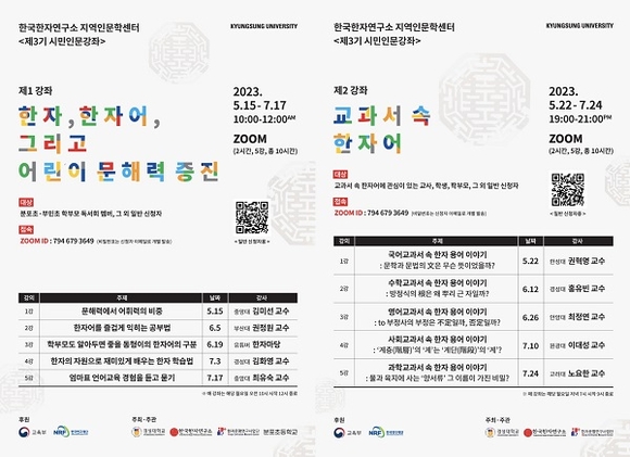 강좌의 진행은 경성대를 비롯해 중앙대, 부산대 등 여러 대학교의 교수들과 유명 유튜버, 학연서당 정길연 원장 등 다양한 분야에서 활동하는 전문가들이 참여한다.