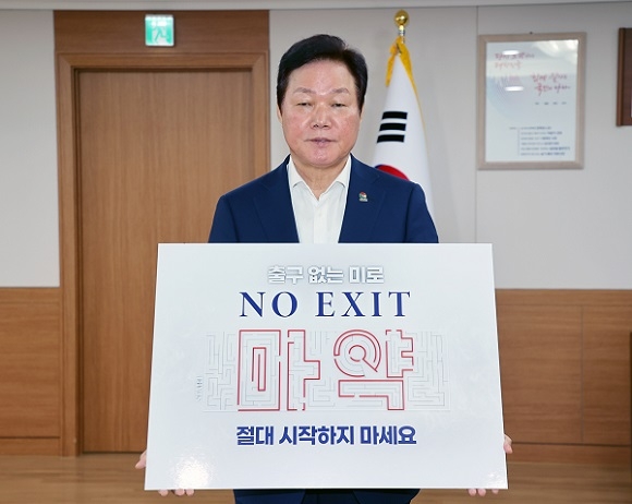 박완수 경남도지사가 3일 오전 도청 도지사실에서 마약범죄 예방을 위한 'NO EXIT' 릴레이 캠페인에 동참했다.