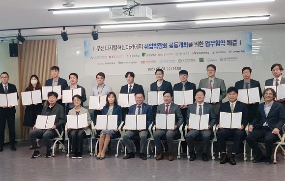 부경대 등 15개 대학은 3일 오후 부산 센텀벤처타운 2층 ICT COA에서 '부산디지털혁신아카데미 취업박람회 공동개최 업무협약'을 체결했다.