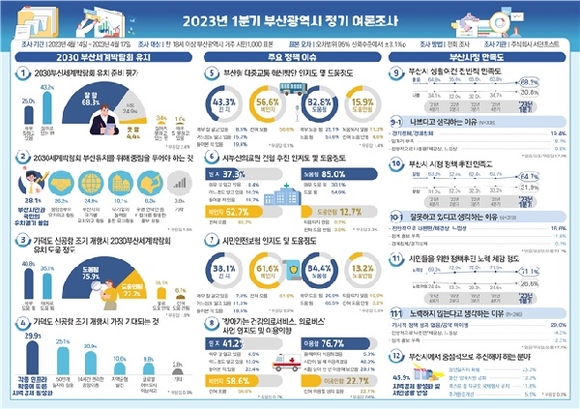 부산시가 시정 주요정책 등에 대한 시민의 의견을 듣는 ‘2023년 1분기 정기 여론조사’ 결과를 발표했다.