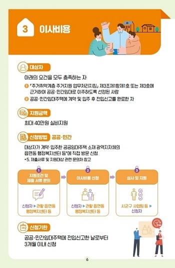 지원 신청은 오는 연말까지 상시로 할 수 있으며, 이주 후 3개월 내(전입일 기준) 영수증을 첨부해 전입지 읍면동 행정복지센터 등으로 방문하여 신청하면 된다.