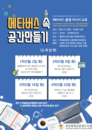 '메타버스 속 공간 만들기'는 박세미 강사와 함께 본교 구성원과 지역주민을 대상으로 도서관 이용자교육실에서 총 4회 진행된다.