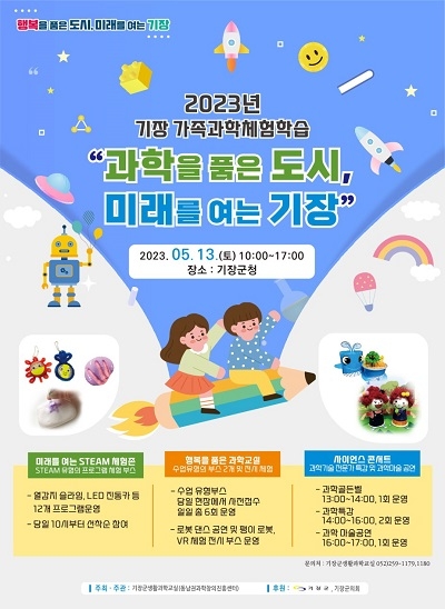 부산 기장군이 오는 13일 오전 10시부터 오후 5시까지 기장군청 로비 및 야외광장에서 다채로운 과학문화를 체험하는 ‘2023년 기장 가족 과학체험학습’ 행사를 개최한다고 8일 밝혔다.