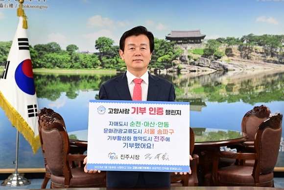 조규일 시장은 지난 2월부터 자매도시인 순천시, 아산시, 안동시와 문화관광 교류도시인 서울 송파구, 그리고 최근 고향사랑기부제 활성화를 위한 업무협약을 체결한 전주시에 기부한 사실을 인증했다.