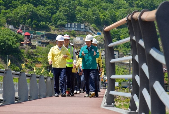 박완수 경남도지사가 안전취약시설의 안전 점검과 여름철 자연재난 대비를 위해 9일 밀양 단장면에 있는 제1아불교와 용포 자연재해위험 개선지구 현장을 점검했다.
