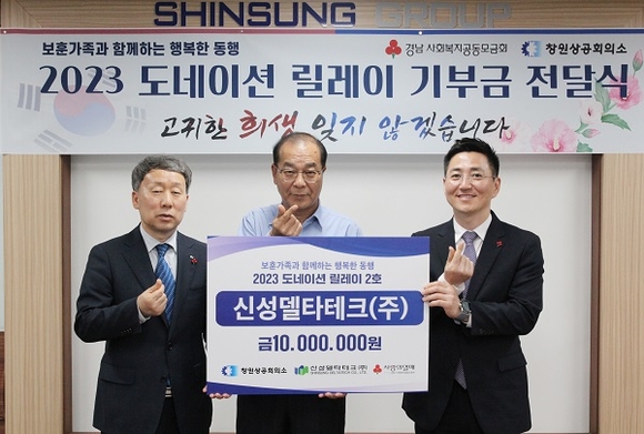 신성델타테크가 10일 창원상공회의소와 경남사회복지공동모금회가 공동 추진하는 보훈 가족과 함께하는 행복한 동행 '2023 도네이션 릴레이 캠페인' 제2호 동행자로 참여하며 기부금 1000만 원을 전달했다.