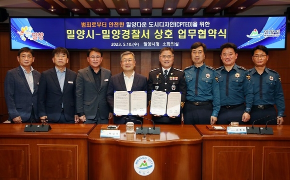 경남 밀양시와 밀양경찰서는 10일 시청 소회의실에서 셉테드(CPTED: 범죄예방 환경설계)로 안전하고 밀양다운 도시디자인을 위한 상호업무 협약을 체결했다.