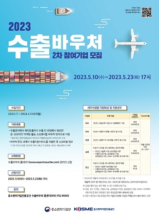 중소벤처기업부(이하 중기부)와 중소벤처기업진흥공단(이하 중진공)은 오는 23일까지 2023년 수출바우처 사업 2차 참여기업을 모집한다고 11일 밝혔다.