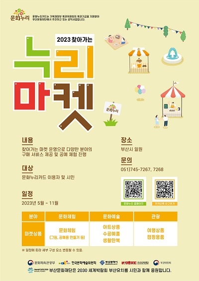 부산문화재단이 5월부터 문화누리카드 이용자가 편리하게 카드를 사용할 수 있도록 지원하기 위해 ‘찾아가는 누리마켓’을 운영한다고 밝혔다.