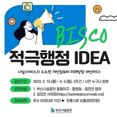 부산시설공단이 다음달 5일까지 3주 동안 ‘시민공감 적극행정 아이디어 공모’를 진행한다고 밝혔다.