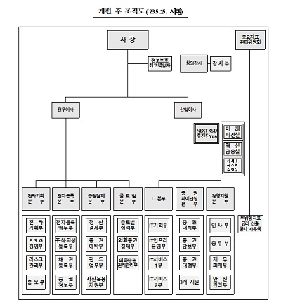또한 토큰증권(ST) 등 혁신금융상품 대응, 신종 수익증권 수용, ESG경영 강화, 윤리‧인권경영 내실화, 자금운용리스크 관리 및 재해복구체계(DR) 관련 조직 정비도 포함됐다.
