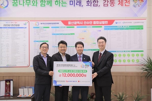 한국동서발전은 16일 울산종합운동장에서 개최되는 '제17회 전국장애학생체육대회' 성공을 기원하며 선수단과 관계자에게 기념품과 함께 격려와 응원의 메시지를 15일 오후 2시 울산광역시 장애인체육회에서 전달했다.
