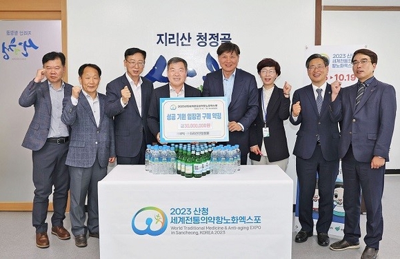 산청세계전통의약항노화엑스포조직위원회는 지난 16일 군수 집무실에서 무학그룹과 2023산청세계전통의약항노화엑스포의 성공 개최와 지역제품 애용 및 상호발전을 위한 후원 업무협약을 체결했다.