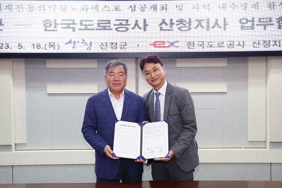 경남 산청군은 18일 군청 군정회의실에서 한국도로공사 산청지사와 '2023산청세계전통의약항노화엑스포 홍보 및 지역경제 활성화'를 위한 업무협약을 체결했다고 밝혔다.