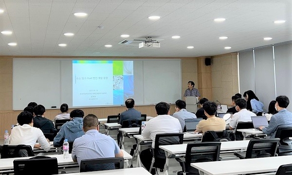 정재우 한국자동차연구원 부문장이 18일 에너지공단 자동차연비센터에서 진행된 '자동차 연비 아카데미'에서 E-fuel 인증 및 수소엔진 산업 동향에 대해 설명하고 있다. (사진=에너지공단 제공)