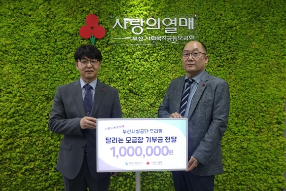 부산시설공단이 특별교통수단 두리발 차량 183대 내 설치됐던 ‘달리는 모금함’을 통해 모은 기부금 100만 원을 사회복지공동모금회 사랑의 열매 부산본부에 전달했다고 19일 밝혔다.