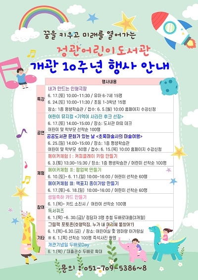 부산 기장군이 정관어린이도서관 개관 10주년을 맞아 6월 한달동안 다양한 기념행사를 연다고 23일 밝혔다.