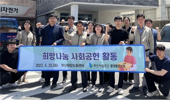 부산시설공단이 23일 부산희망드림센터에서 노숙인 대상 무료급식 배식 봉사와 함께 전문기술 인력을 활용한 센터내 주요 시설물 점검과 기술자문, 주변 화단정비 등 기술재능 봉사활동을 진행했다고 밝혔다.