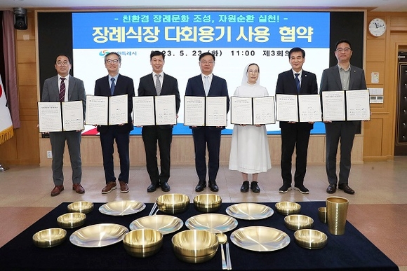 이번 협약은 장례식장에서 주로 쓰이는 1회용 컵·수저·접시·용기 등 1회용품 사용을 줄이기 위해 시와 장례식장, 지역자활센터가 힘을 모은 것.