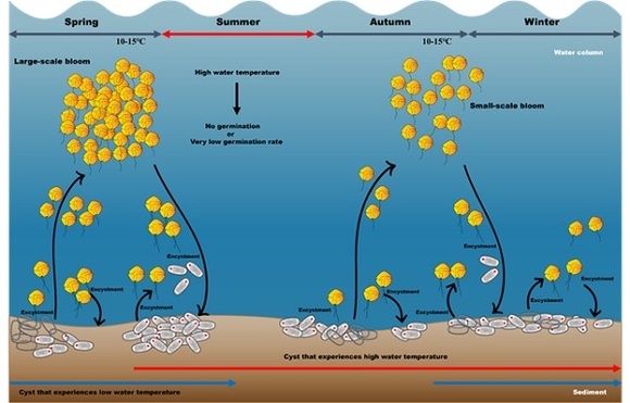 그 동안 학계에서는 알렉산드리움이 형성하는 휴면포자는 휴면기를 가지며 휴면기에는 어떠한 환경요인의 자극에도 발아를 하지 않는 것으로 알려져 왔으나 이번 연구를 통해 퇴적물에서 알렉산드리움의 휴면포자는 휴면기와 관계없이 넓은 온도 범위에서 발아 할 수 있다는 것을 밝혀냈다.