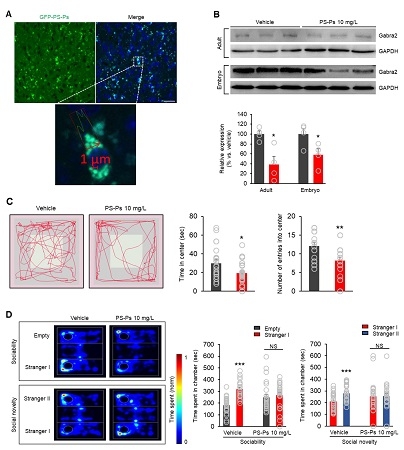 그 결과, 연구팀은 미세플라스틱이 태아의 뇌에 축적될 뿐만 아니라 자손 마우스의 젖먹이 시기에 모체의 유선(乳腺)을 통해 지속적으로 뇌에 축적되고 있음을 확인했다. 또한 태아 마우스의 뇌에서는 신경발달 관련 유전자의 발현이 감소했고, 태아 및 성인 자손 마우스에서 뇌 기능 조절에 관여하는 억제성 신경전달물질인 감마-아미노뷰티르산(GABA, Gamma-aminobutyric acid) 수용체 subunit 중 하나인 Gabra2의 유전자 발현이 유의성 있게 감소했음을 관찰했다. 이렇게 미세플라스틱에 노출된 임신 마우스의 자손은 불안 및 우울 장애, 사회성 결여와 같은 비정상적 행동이 유발되는 것으로 나타났다.