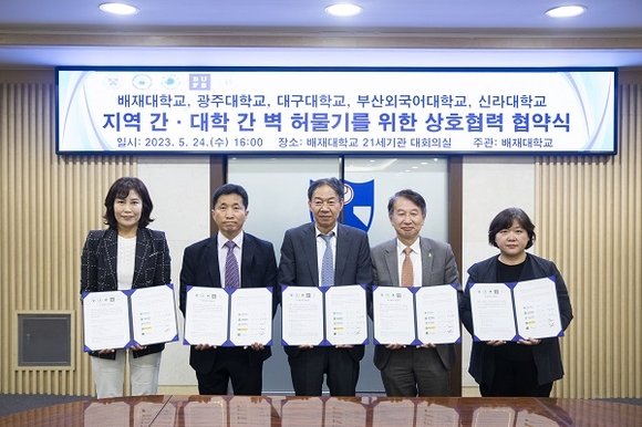 지난 24일 배재대 총장실에서 배재대 김욱 총장, 광주대 김갑용 부총장, 신라대 유영명 인문상경대학장, 부산외대 정명숙 국제교류처장, 대구대 이희정 한국학연구소 소장 등 각 학교의 주요 관계자가 참석한 가운데 상호협약식이 진행됐다.
