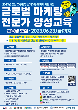경남대학교 글로벌비즈니스연구센터는 오는 6월 23일까지 해외영업·물류·구매·자재 직무로 취업을 희망하는 도내 미취업자를 대상으로 '글로벌 마케팅 전문가 양성교육' 교육생을 모집한다.