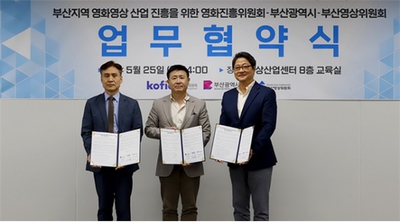 부산시와 부산영상위원회, 영화진흥위원회가 25일 오후 2시 영상산업센터 8층에서 지역 영상 생태계 조성 및 영화영상산업 활성화를 위한 3자 업무협약을 체결했다.