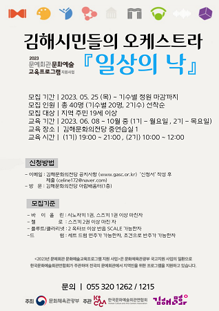 '김해시민들의 오케스트라 '일상의 낙'' 프로그램 참가신청은 김해문화의전당 홈페이지를 참고해 이메일 또는 현장 접수로 가능하다. 접수 및 강좌 문의는 전화로 하면 된다.