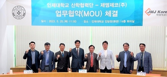인제대학교 산학협력단과 제엠제코가 지난 25일 인제대학교 인당관 14층 회의실에서 업무협약을 체결하고 단체 기념촬영을 했다. (사진=인제대 제공)