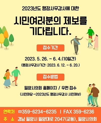 밀양시의회는 올해 행정사무감사에 앞서 26일부터 6월 4일까지 시민제보를 받는다고 밝혔다.