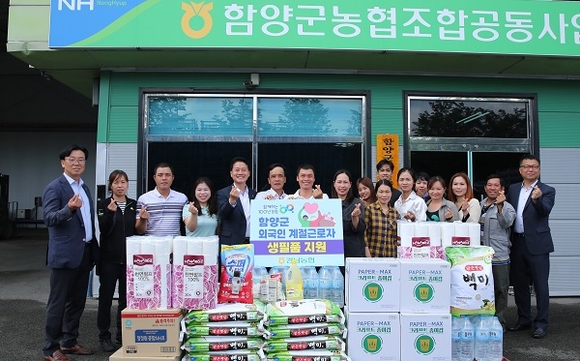 경남농협은 30일 함양군조합공동사업법인을 방문해 공공형 계절 근로사업을 통해 입국한 함양군 외국인 계절 근로자에게 생필품을 전달했다.