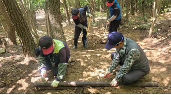 공단 직원들이 태종대유원지 일원 산책로 구간에 목계단을 설치하고 있다.(사진=부산시설공단 제공)