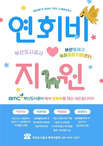공사는 맞벌이 가정 등의 육아 부담을 해소하고 양육친화적인 지역사회를 조성하고자 동래행복주택 내 신혼부부, 한부모가족 등 만 5세 이하 취학 전 영유아와 부모를 대상으로 연회비 1만원을 지원한다. 기존회원은 사업기간 내 접수를 통해 기존 만료일로부터 1년간 연장이용 지원을 받을 수 있다.