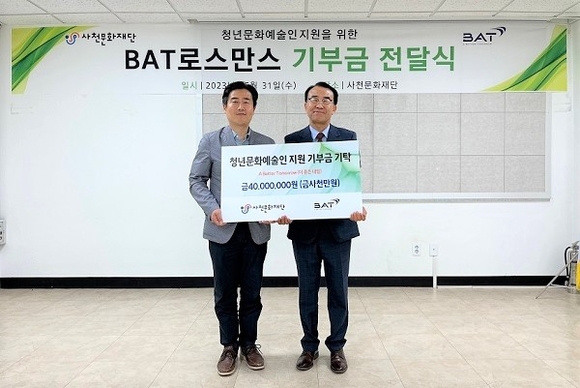 BAT로스만스는 지난 31일 사천문화재단에서 '2023년 청년문화예술지원사업' 기부금 전달식을 갖고 후원금 4천만원을 전달했다.