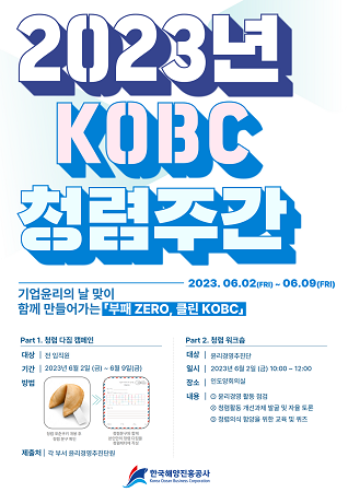한국해양진흥공사는 지난 2일 기업윤리의 날을 맞아 2일에서 오는 9일까지 일주일간을 '2023 KOBC 청렴주간'으로 정하고 임직원 청렴의식 제고를 위한 각종 활동에 나섰다고 밝혔다.